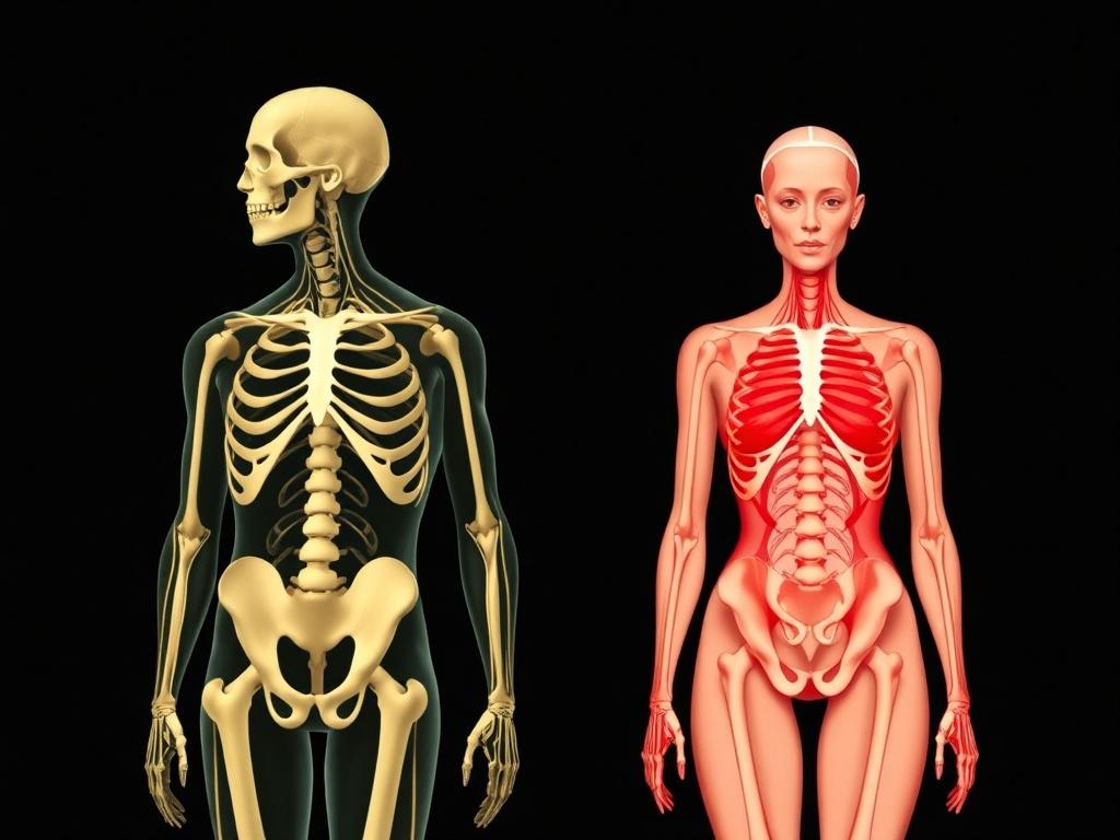 На уровне скелета различия заметны в пропорциях. Мужские кости обычно крупнее, с большей поперечной и продольной прочностью, тогда как кости женщин менее массивные, но обладают плотностью, меняющейся с циклом и возрастом.